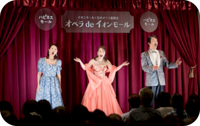 文化・芸能・芸術などを各モールでお客さまが身近に感じていただける体験を提供するために、館内の多目的スペース「イオンホール」やオープンスペースなどを活用し、お子さまから大人まで楽しめるプログラムを豊富にご用意しています。日本トップクラスの実力を誇る日本オペラ振興会による本格オペラコンサート「オペラ de イオンモール」、市川九團次さんなど歌舞伎の舞台で活躍された俳優さんをお招きし歌舞伎を知って楽しめる「イオンモールde歌舞伎」、さらには芸歴60年を超える桂福團治とその一門による「イオンモール落語」など、本格的な公演を2026年2月までで通算581回開催しました。