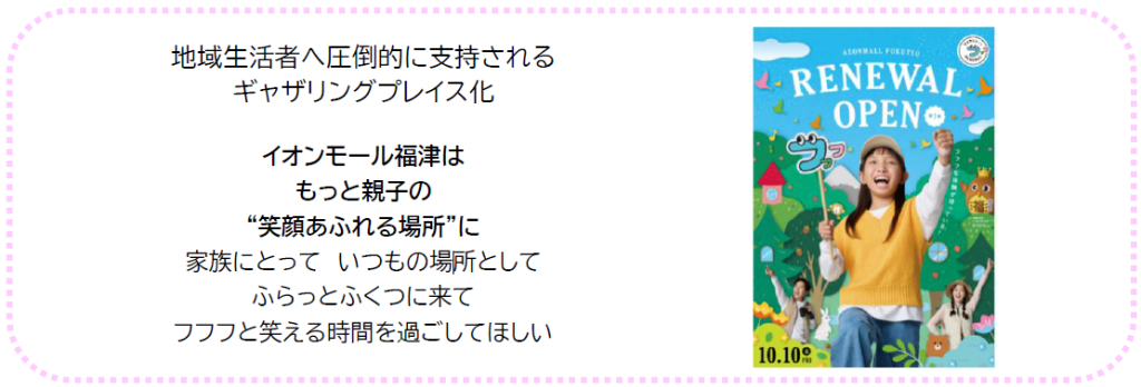 イオンモール福津(以下、「当モール」)は、24店舗を刷新するリニューアルを実施し、10月10日(金)より、順次リニューアルオープンします。
