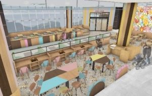 「FOOD FOREST」は花柄と『ふくふくちゃん』をモチーフにした壁面にカラフルな色使いのテーブルとイスを設置します。また、新たに小上がり席を導入し、ご家族皆でご利用しやすい空間へと生まれ変わります。