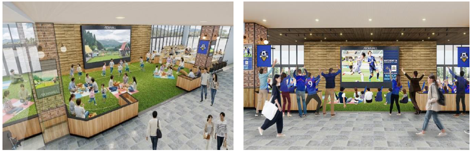 ・西館フードフォレスト内のイベントスペース「きときとステージ」は遊んだり、食事をしたり、家族でピクニック気分を楽しめる芝生エリアが誕生。スポーツ開催時は大型ビジョンで試合観戦ができる、にぎわいのステージに変わります。
