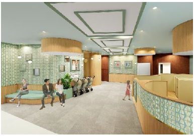 ・外壁デザインは、豊かな田園風景の景観と調和する淡いグレートーンの色彩をベースに、高岡の情緒あふれる街並みを感じさせる柄を壁面にアレンジ、明るく温もりのあるデザインに刷新します。