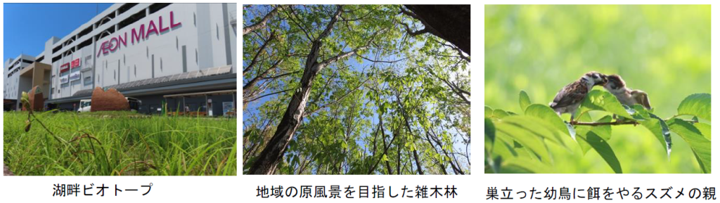 当モールは、地域に自生する在来種の苗木を用いた「イオン ふるさとの森」の保全をはじめ、琵琶湖岸の湿生草原をモデルとした湖畔ビオトープの設置、オープン前から絶滅危惧種による原風景の再現など、自然との共生を目指したモールづくりを推進してきました。現在では、周辺緑地とのエコロジカルネットワークを通って動植物が移り住み、植物197種、鳥類17種、昆虫118種が緑地で暮らしていることが確認されています。さらに、スズメが子育てする姿や、周りの水辺から飛来するトンボの姿など、普通種から希少種まで多様ないきものがみられる豊かな自然へと変化をとげています。