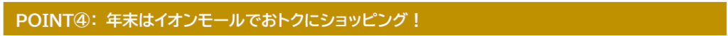・内 容 : 今年最後の特別な2日間として、各専門店にいろいろな特典をご用意。さらに、イオンゴールドカードでお支払いいただくと請求時に5%OFFとなります。