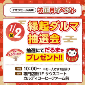 ・内 容 : 当日お買い上げのイオンスタイル高崎及びイオンモール高崎専門店夫々での1,000円(税込)以上のレシート(合算可)ご提示で参加できる抽選会です。当選時は群馬県ふるさと伝統工芸品の高崎だるまをプレゼント。