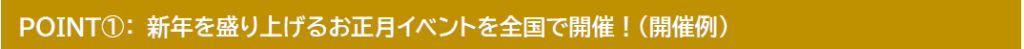 当社では、元日から、正月の風物詩を体感していただけるよう、新年を祝う装飾を施した華やかな空間で皆さまをお出迎えし、お正月ならではのイベントを全国のイオンモールで開催します。