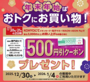 ・内 容 : イオン・イオンスタイルで3,000円(税込)以上をイオンカード・電子マネーWAON・AEON Pay決済でお買い上げいただいたお客さまに、後日イオンモール専門店でご利用いただける500円引きとなるクーポンをプレゼントします。