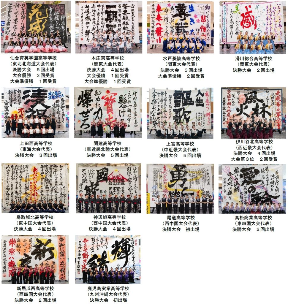 本大会は、書道を通じた新たな文化の創造と発展、文化芸術における地域間交流を促進することを目的に、2015年に中四国エリアで初開催し、2021年より全国へと拡大しました。書道パフォーマンスの全国的認知度の高まりから、年々参加校も増え(第1回:74校、第2回:93校、第3回:97校、第4回:104校)、第5回となる本大会は31都府県から107校の応募があり、書道パフォーマンス大会としては最大規模となりました。決勝大会には各エリア大会を勝ち抜いた代表校14校が出場し、2025年度の日本一を目指して競います。