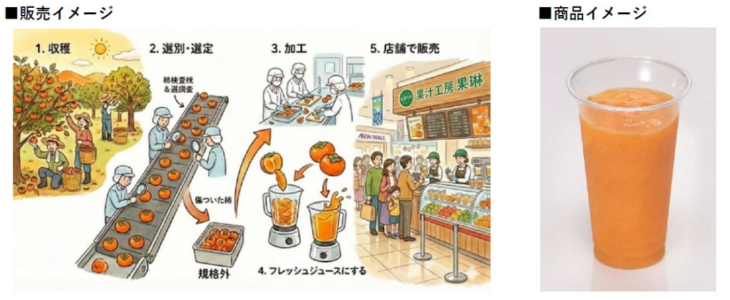 JA佐渡、JA全農にいがた(以下、全農)、青木フルーツ株式会社、イオンモール株式会社の4者は、佐渡産「おけさ柿」の規格外品を有効活用したジュースを期間限定で販売いたします。